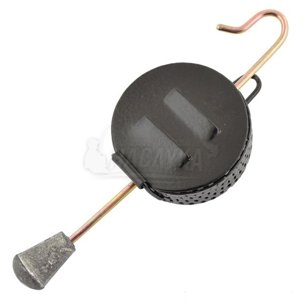 Метална хранилка Bait dropper с черно матово покритие, която служи за точно захранване в река или язовир.