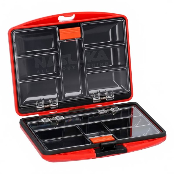 Кутията и прозрачните капачета на отделенията се отварят с бутон, което улеснява бързото намиране на необходимите аксесоари. Със своя компактен размер и червен цвят тази кутия е идеалният спътник за всяко риболовно пътуване.