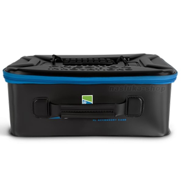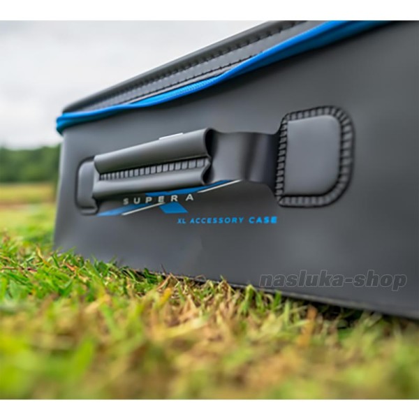 Preston Supera X XL EVA Accessory Casе е снабдена с твърд капак и две дръжки. По принцип е предназначена за поставяне в платформа, но може да се използва и като самостоятелна кутия.