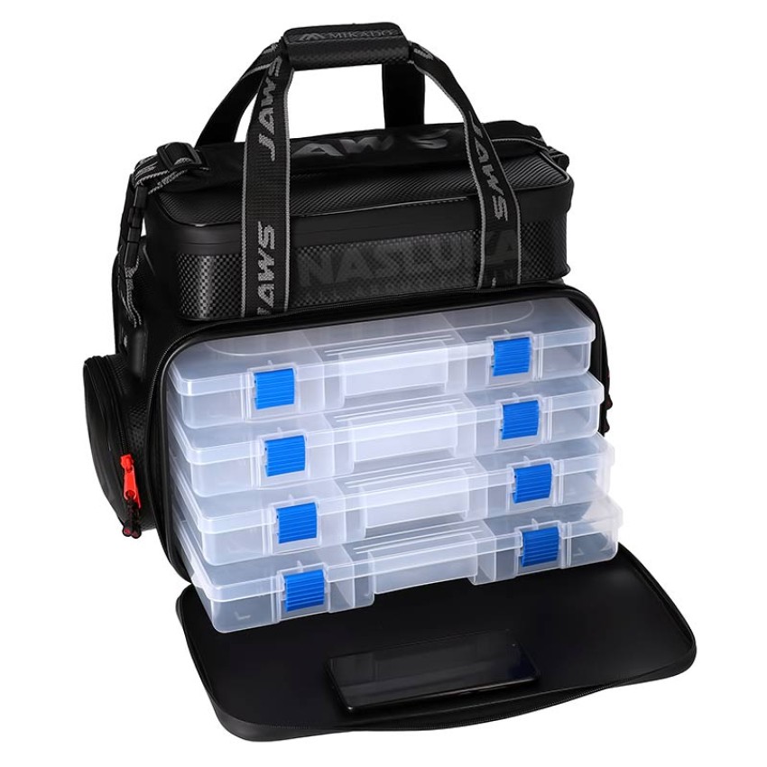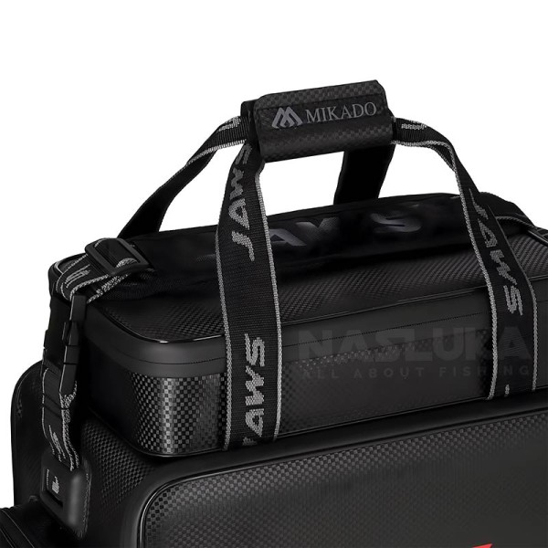 Mikado EVA Jaws M разполага с три подсилени аксесоарни кутии, калъф за макара и дори хладилна секция, за да запазите вашите стръв и напитки свежи. За максимален комфорт при носене, чантата е снабдена с подплатен гръб и дръжки, както и с регулируема презрамка.