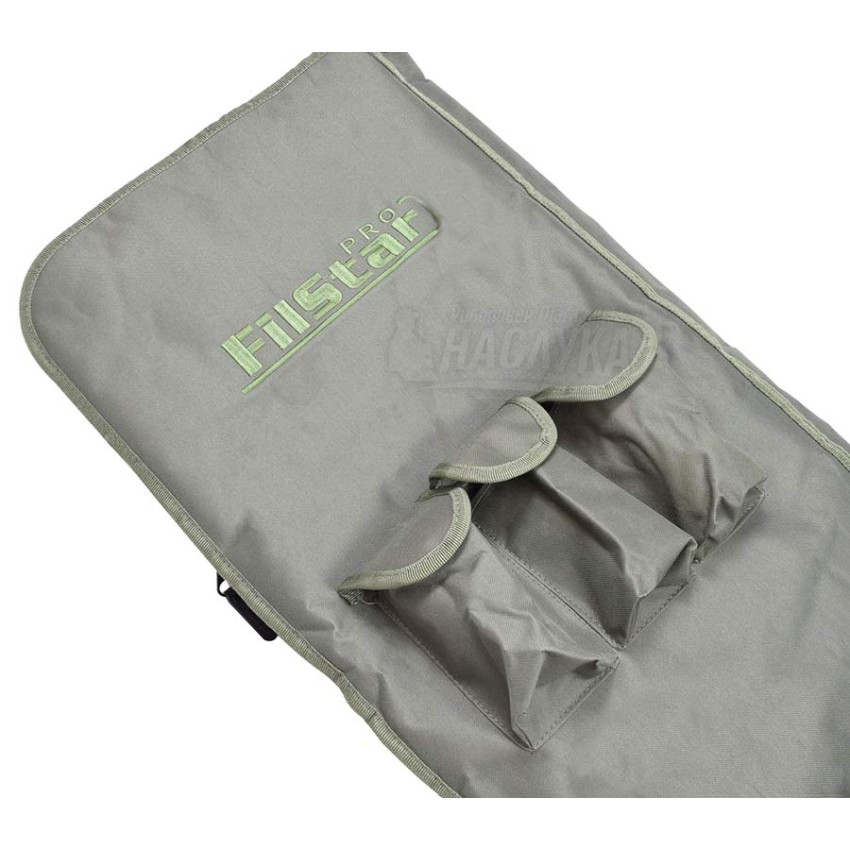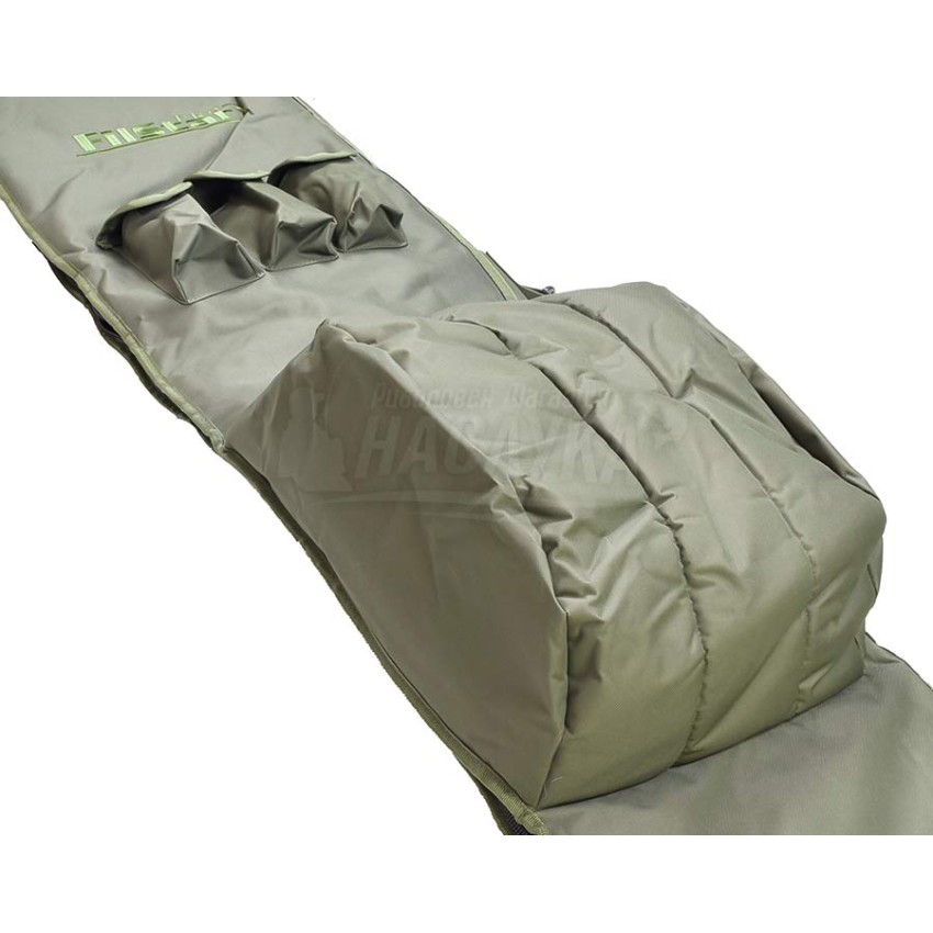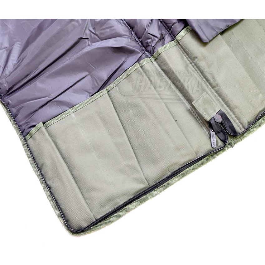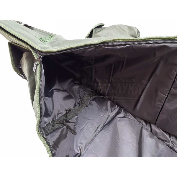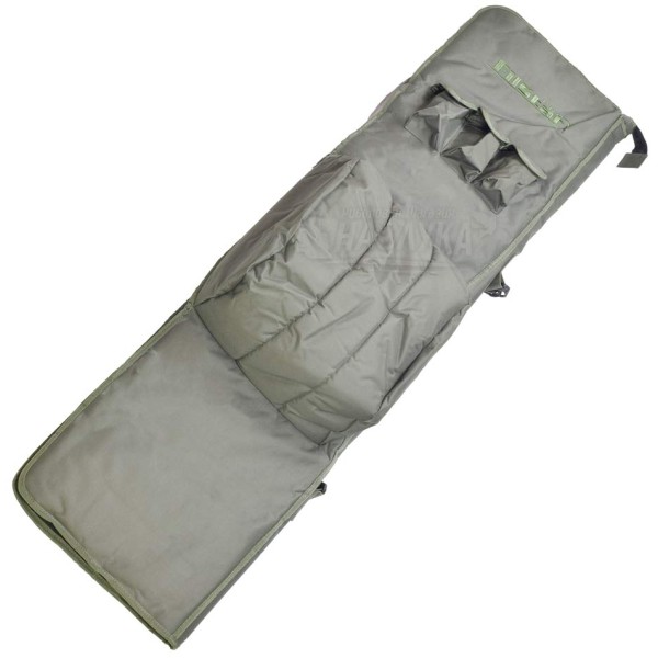 Великолепен калъф за шаранджийски въдици, изработен от висококачествен, здрав плат в тъмнозелен цвят. Калъфът е с дебела мека подплата от всички страни, включително и между двата комплекта въдици. Предназначен е за общо шест триколенни въдици - три с макари и три без макари. В долния край въдиците се поместват в предвидени за целта джобове, а отгоре с помощта на връзки се прихващат към вътрешната страна на калъфа. Отделението за макарите е с височина 40 см и също е подплатено. От външната страна на калъфа над отделението за макарите са добавени три джоба с капаци с велкро лепенки, предназначени за сигнализатори. От другата страна има два вертикални джоба, подходящи за по-обемисто оборудване или аксесоари, като колчета, чадър, кеп и др. Големият външен джоб е с размери 115 х 22 см, а малкият - 70 х 17 см. Калъфът е оборудван с регулируем и подплатен ремък с вирбел за носене през рамо, както и с удобна дръжка.