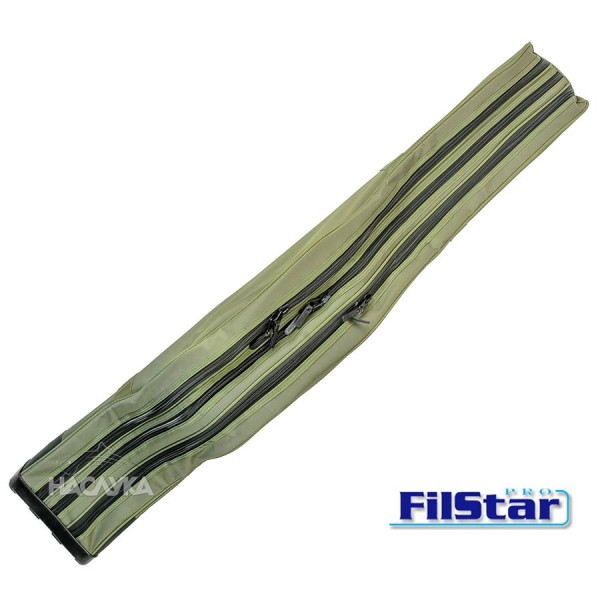 Троен твърд калъф за шарански въдици от Filstar с три обособени отделения за въдици с макари, които са отделени с ципове. Калъфът е изработен от висококачествени синтетични материали, като външната част е от износоустойчив полиестер. Мека подплата между отделенията, за да не се нараняват пръчките и макарите при транспорт.