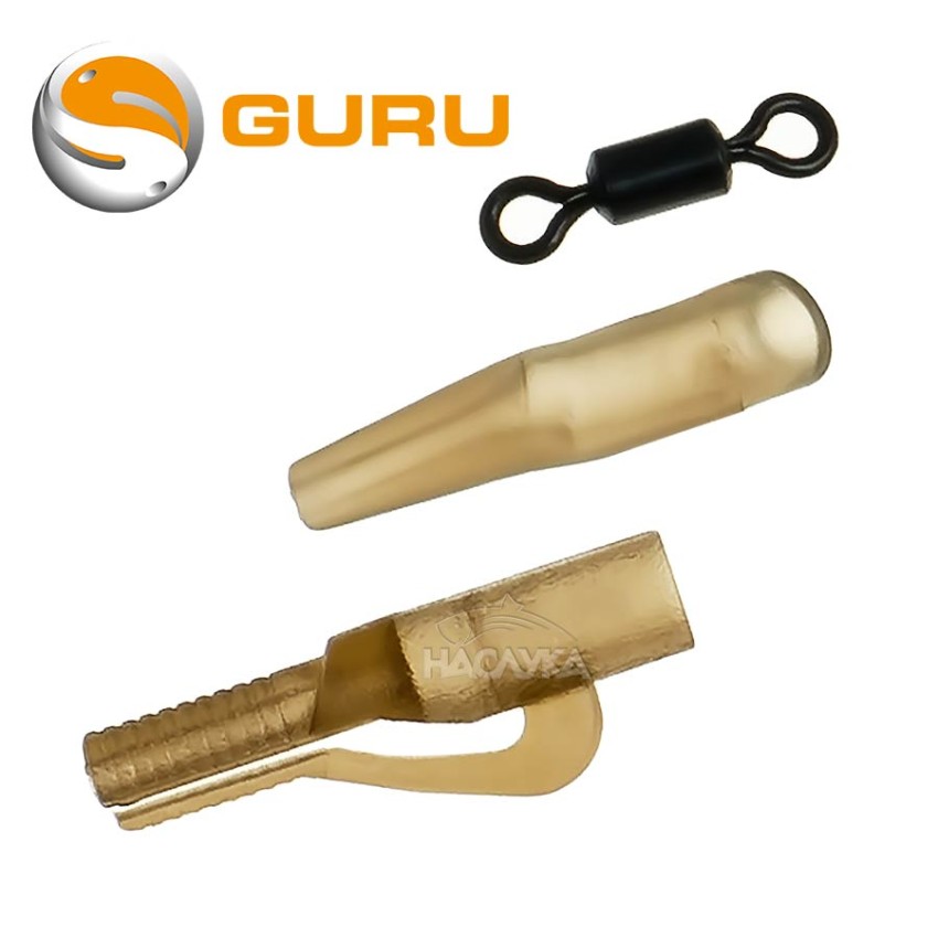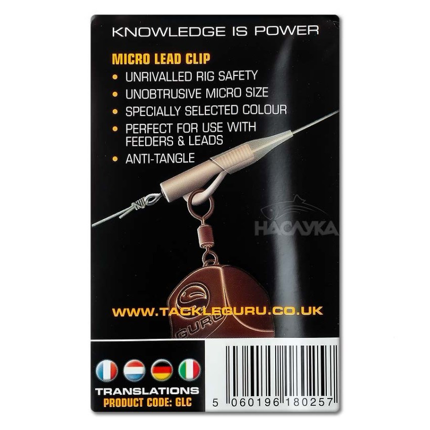Guru Micro Lead Clip е мини версия на оловните клипсове, които шаранджиите използват от години. Тези клипове са изваяни така, че да се слеят с риболовната линия и да устоят на заплитания при полет. Силиконовият конус перфектно пасва на тялото на клипса, като допълнително засилва свойствата против заплитане. Може би най-важното е, че Micro Lead Clips са напълно безопасни за рибата. Цветът е избран така, че се слива напълно и практически изчезва на дъното.