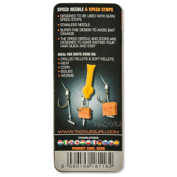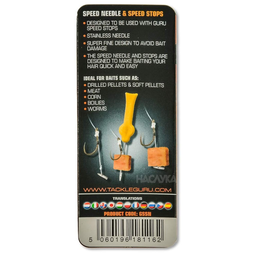 Комплект от висококачествена игла GURU за поставяне на стръв и 36 броя стопери - Speedstops. Системата Speedstop позволява свръхбързо монтиране на пробити пелети, меки пелети, дъмпели и бойли при монтаж на косъм. След закрепване на малкия пластмасов стопер за косъма, той лесно се захваща към иглата и нанизването на стръвта става за секунди. След като се постави стопера, той действа и като ограничител на косъма.