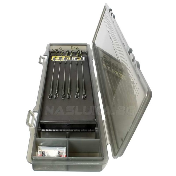 Практична кутия за съхранение на шарански монтажи и шест броя монтажи BlowBack Combi Rig от серията Filstar Premium Carp.