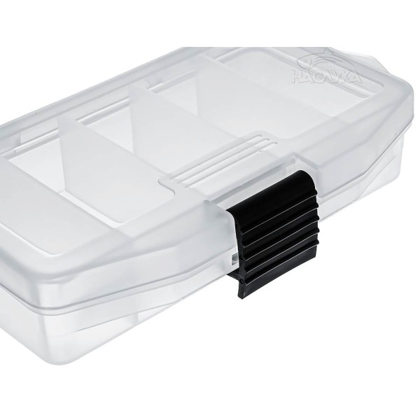 Удобна и компактна кутия за риболовни принадлежности и аксесоари от Filstar. Снабдена е с прозрачен капак и надеждно закопчаване. Кутията е с 5 отделения, подходяща за съхраняване и транспортиране на куки, вирбели, силиконови примамки, джиг глави, чебурашки и др. Изработена от прозрачна пластмаса с надеждно закопчаване.