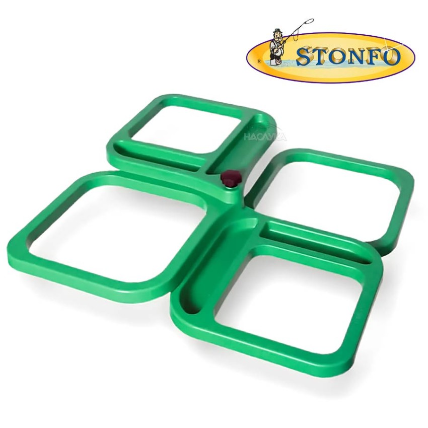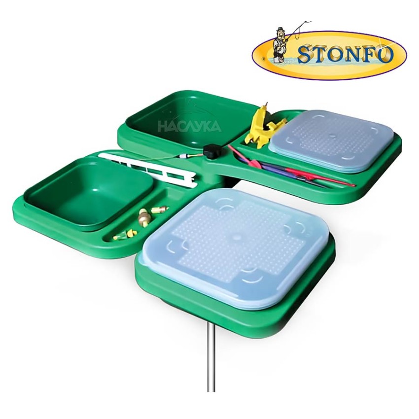 Изключително удобна поставка за кутии с четири отдела, която в сгънато състояние заема много малко място. Два от отделите имат допълнително място за поставяне на различни риболовни аксесоари като плувки, тежести, игли, ножици и др. Другите два отдела са широки и позволяват поставянето на по-големи кутии. Стойката е с метална универсална резба за прикрепяне към колче. Италианско качество от Stonfo!