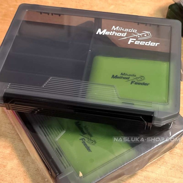 Към Mikado Method Feeder Compact Box има добавена допълнителна по-малка кутия в яркозелен цвят с 13 отделения, предназначена за дребни аксесоари, куки, вирбели, халки, рингове, стопери и т.н.