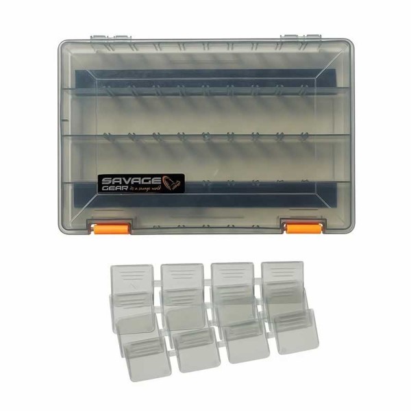 Прозрачна кутия за примамки, изработена от опушено сив PP материал с UV защита, подходяща за съхранение на блесни, воблери, джигове и др.