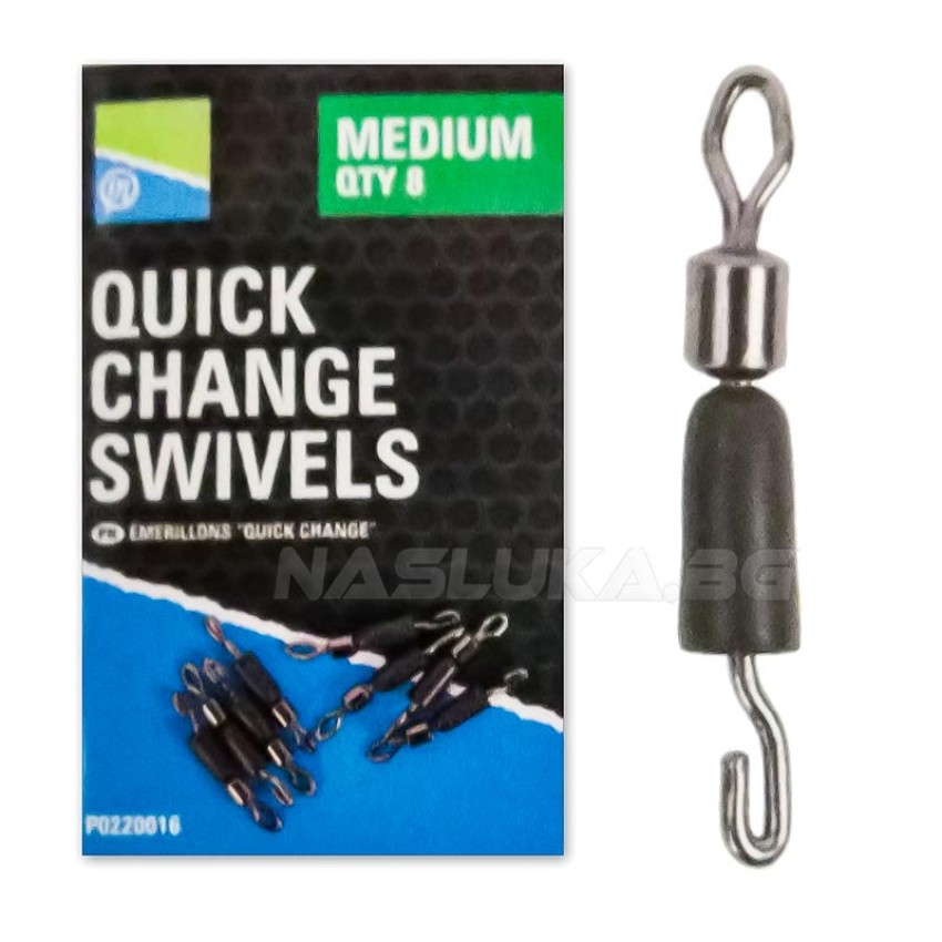 Quick Change Swivels са предназначени за свързване на основната линия и повода, като дизайнът им позволява бързата и лесна подмяна на куката или промяна в типа на повода при необходимост.