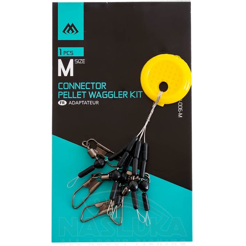 Mikado Connector Pellet Waggler Kit включва 5 готови комплекта, състоящи се от вирбел с мънисто, карабина и овални стопери.