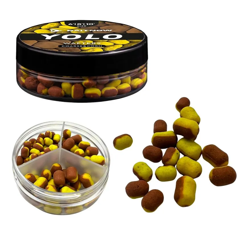 Балансираните дъмбели Mikado Baitnow Yolo Wafters са специално създадени за метод фидер. Двуцветната комбинация от жълто и бронзово-кафяво перфектно имитира естествена храна и привлича вниманието на рибата.