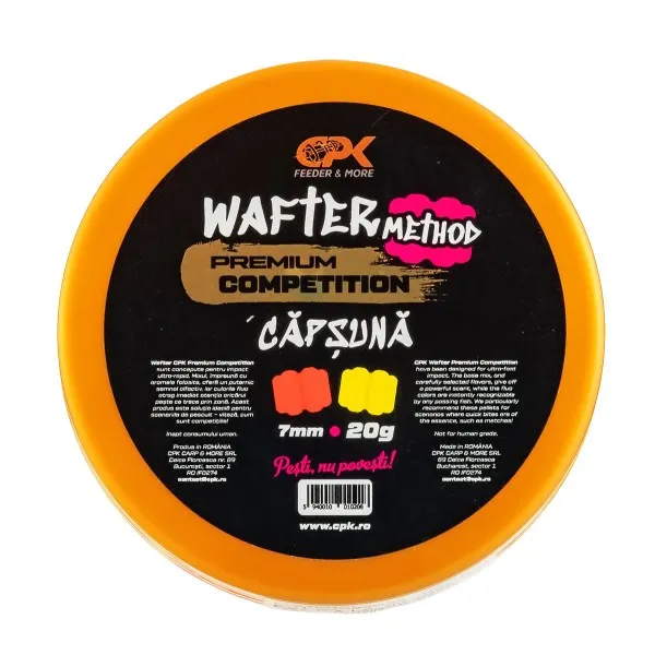 Дъмбелите CPK Competition Method Wafter са подходящи за състезателен фидер риболов и техники с висока динамика. Тези вафтери осигуряват моментален визуален и аромален ефект благодарение на интензивния аромат на ягода и ярките флуоресцентни цветове. 🎣