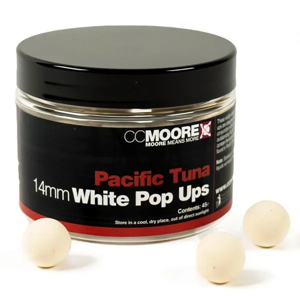CC Moore Pacific Tuna White Pop Ups са високо качествени плаващи топчета, създадени специално за допълнение на Pacific Tuna бойлите. Тези бели попъпи осигуряват отлична видимост под водата и са натоварени със силен рибен аромат.