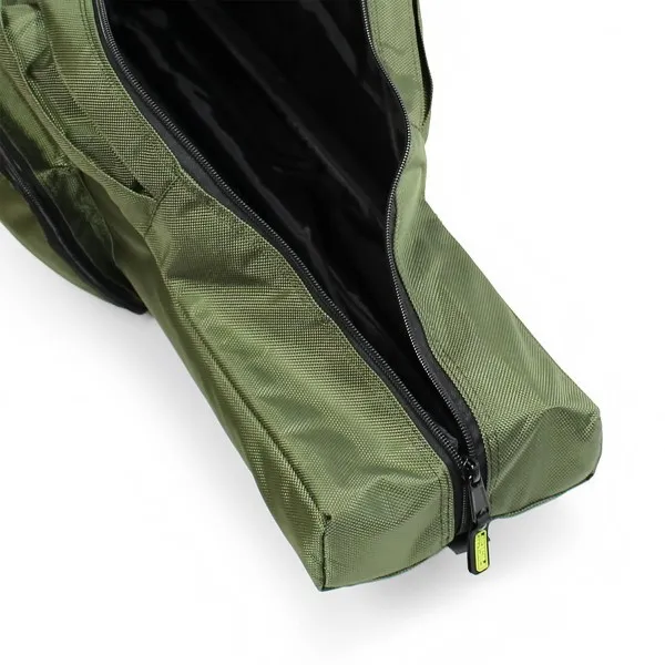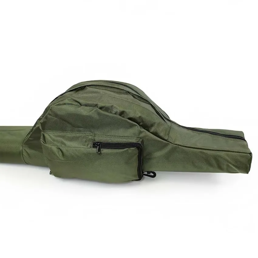 Калъфът разполага с голям страничен джоб с размери 25 x 13 x 4 cm за съхранение на риболовни принадлежности.