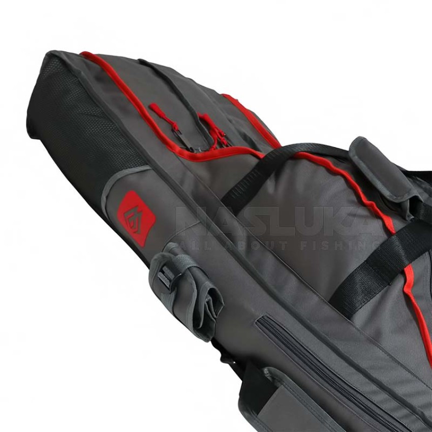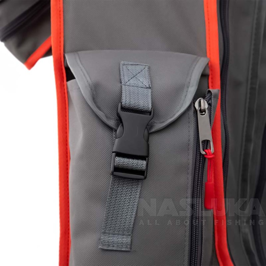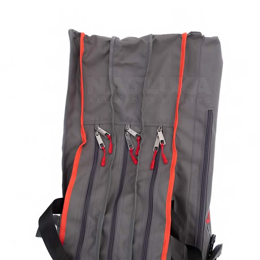 Калъфът разполага с три просторни отделения с цип, които позволяват отделно съхранение на всяка въдица. Множеството странични джобове, също с ципове и закопчалки, предоставят допълнително пространство за съхранение на колчета, бъзбарове, аксесоари и други необходими принадлежности. Здравите ципове с гумирани накрайници, както и дръжките с велкро и подплатената презрамка, осигуряват удобство при носене и лесен достъп до съдържанието.