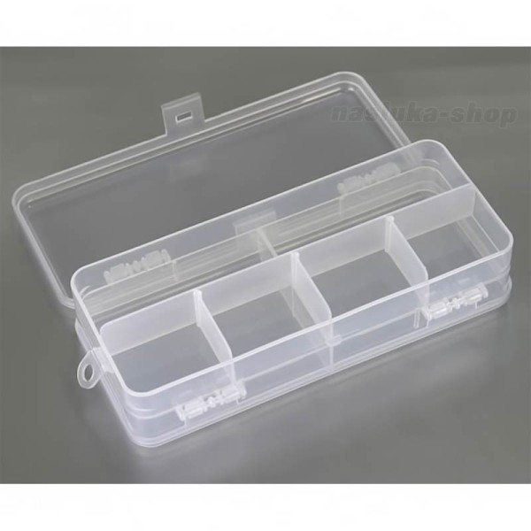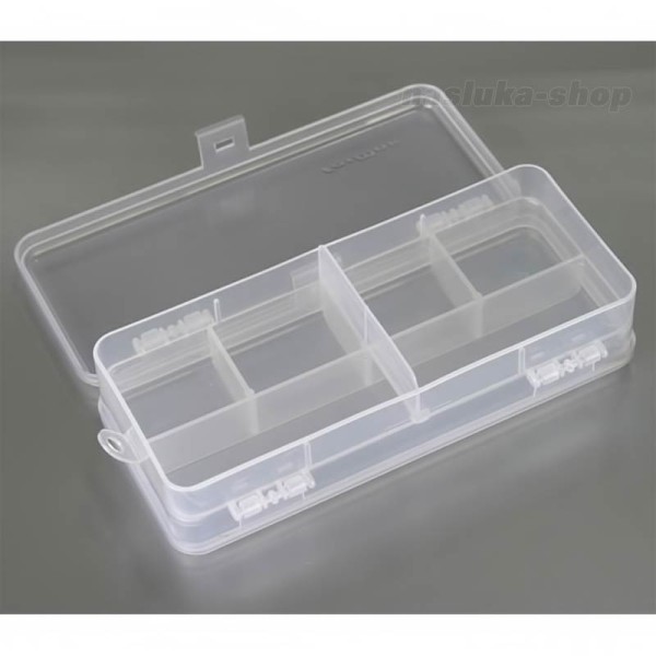 Кутията е с 5 отделения от едната и 2 отделения от другата страна. Отделенията са с различни размери, което позволява оптимално разпределение на примамки, куки, вирбели, стопери, шлаухи и различни компоненти за монтажи.