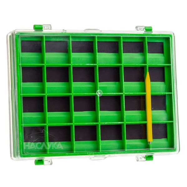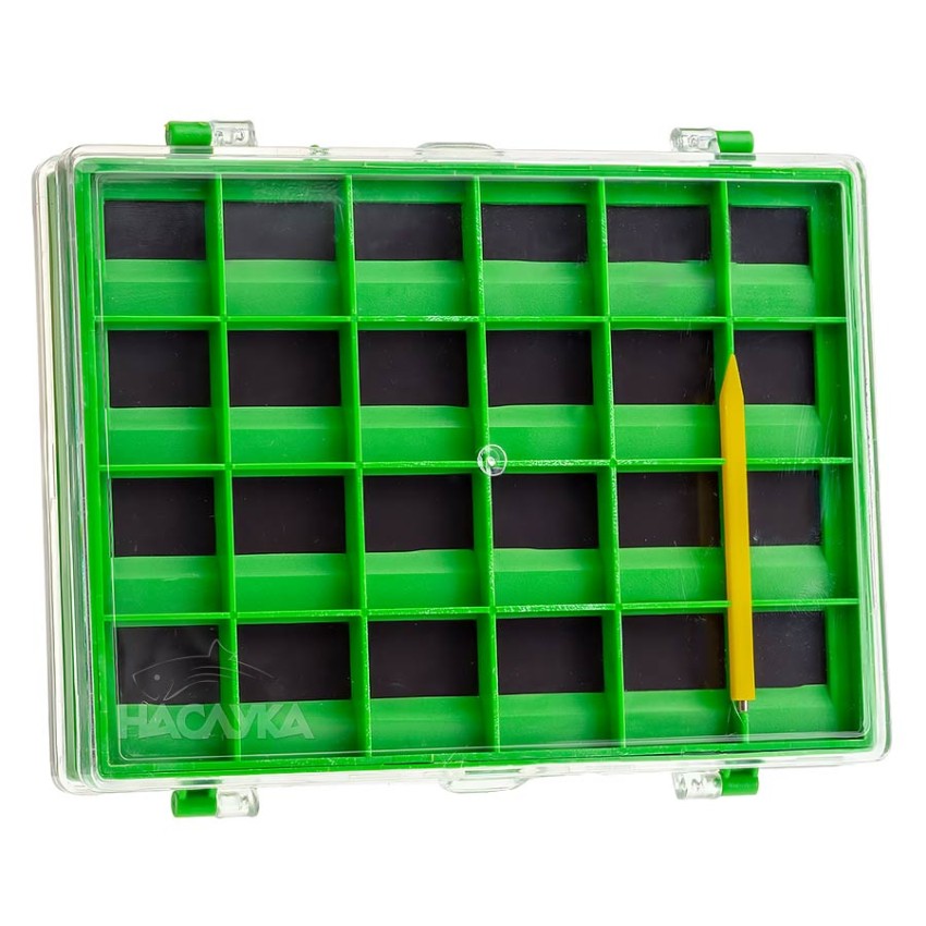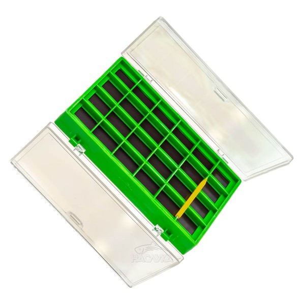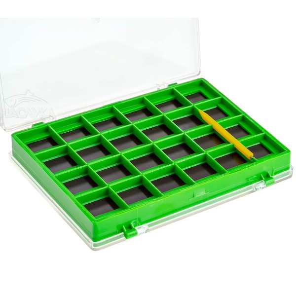 Двулицева кутия с магнитно дъно, разделена на много прегради. Подходяща за съхранение на куки, вирбели и др.