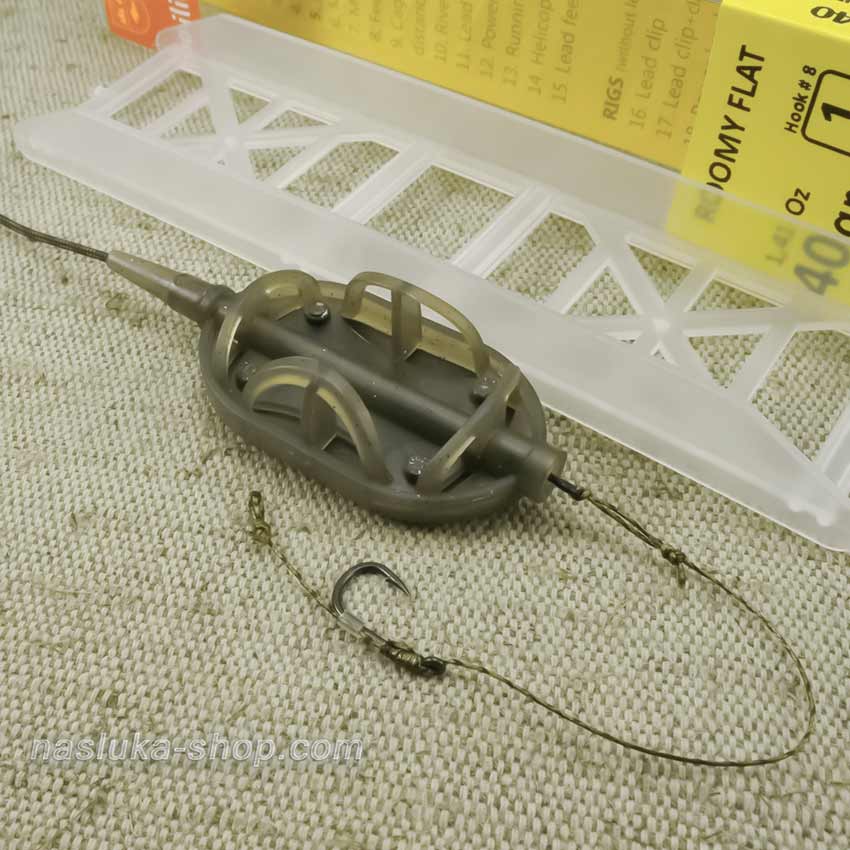 Монтаж за фидер Roomy Flat - Rig 53 включва плоска фидер хранилка Orange Roomy Flat, която остава на дъното винаги с утежнената страна надолу и хранителния микс нагоре, така че мигновено може да бъде открита от рибите.