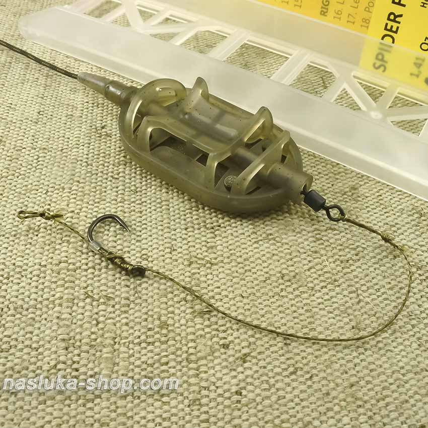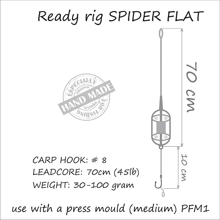 Монтаж за фидер Spider Flat - Rig 51 включва плоска фидер хранилка Orange Spider Flat, която остава на дъното винаги с утежнената страна надолу и хранителния микс нагоре, така че мигновено може да бъде открита от рибите.