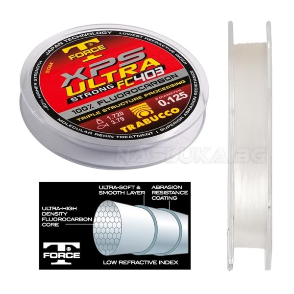 Trabucco XPS Ultra Strong FC 403 е ново поколение флуорокарбон, който е с 40% по-здрав от останалите влакна. Той е невидим, устойчив на абразия и безразличен към светлина.