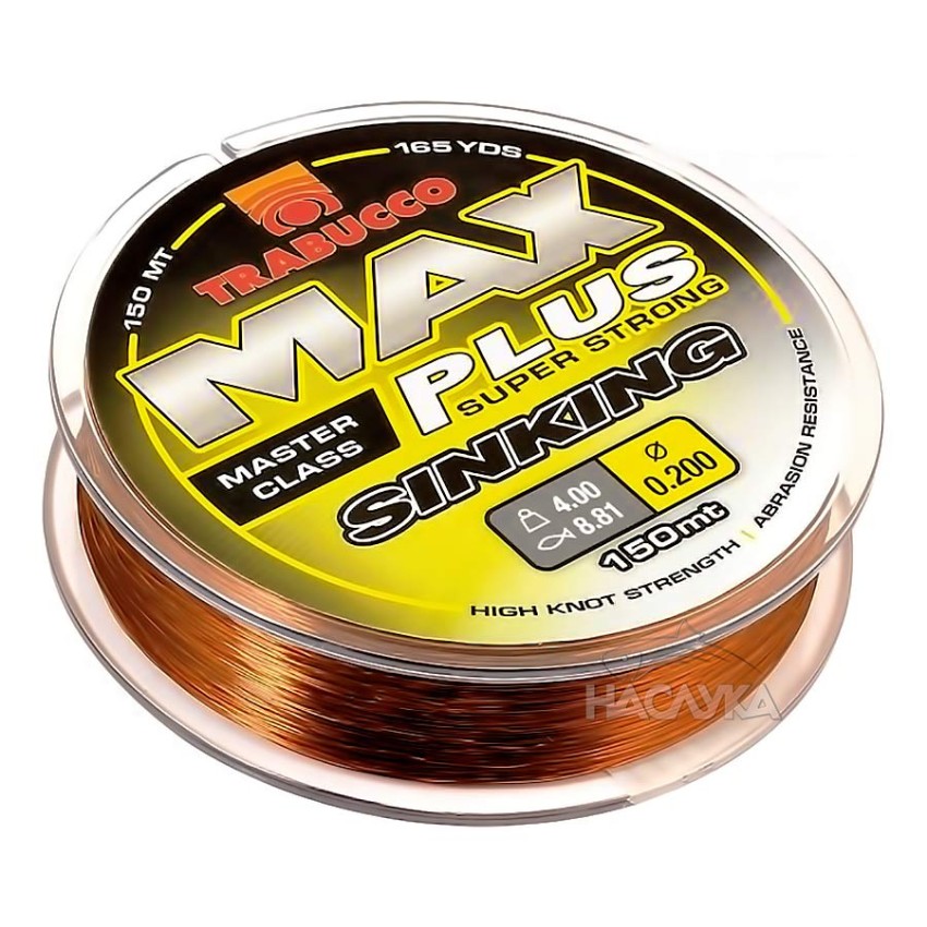 Истинско японско влакно, проектирано за риболова на мач и фидер. Основното предимство в това направление е голямата му тежест, позволяваща безпрепятствено потъване след замятане. Уникалната устойчивост на абразия гарантира безпроблемното му използване на водоеми с труден релеф, с каменисто дъно, при закачки и други. Сравнено с повечето монофилни влакна на пазара, Trabucco Max Plus Super Strong Sinking се отличава с ниска разтегливост, което допринася за сигурното засичане, закачане и изваждане на рибата. Удачно подбраният тъмнокафяв цвят спомага сливането на влакното с дъното. Предлага се в отделни разфасовки по 150 метра, които са UV защитени. Цвят: Тъмнокафяв.