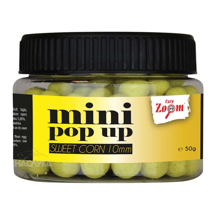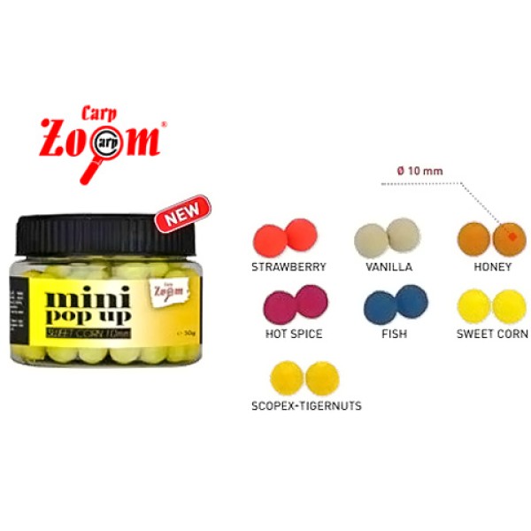 10 мм мини версия на супер успешните плуващи топчета на Carp Zoom. Благодарение на различните аромати и цветове Carp Zoom Mini Pop Up могат да се използват във всеки сезон. Новата формула осигурява страхотен ефект на привличане и подобрява плаваемостта. Топчетата могат да се използва самостоятелно или по двойки, като в този случай се препоръчват различни цветове. Предлагат се в практично бурканче с най-популярните цветове и аромати.