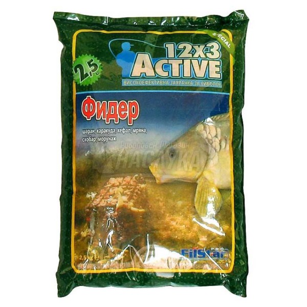 Захранка, разработена специално за риболов с 'отворен фидер' - хранилка. Подходяща е за риболов както в спокойни, така и в течащи води - реки, канали, езера и други затворени водоеми. Много активна веднага след подаване, привлича различни видове риба - шаран, каракуда, платика, червеноперка, лин и други. Атрактивният й цвят и неустоим аромат я правят универсална и лесно забележима за всички видове риби, хранещи се в придънния воден слой.Препоръки: Винаги се стремете да концентрирате хранителното петно във възможно най-малък периметър. Освен точно замятане това изисква и правилно приготвяне на сместа. Ако ловите в плитки водоеми без никакво течение може да подготвите сравнително суха захранка за да може да 'експлоадира' при досега си с повърхността. Когато работите в дълбоки и течащи води е необходимо да овлажните сместа добре. Така ще сте сигурни, че захранката достига дъното, както е поставена в хранилката и започва да се разпада след досега си с него. Това е единствения начин за правилно подготвяне на хранително петно. Препоръчително е към сместа да добавите от стръвта, с която ловите - бели червеи, нарязани торни червеи, царевица или натрошени пелети (гранули). Захранките от серията 12х3 Active са произведени по уникална рецепта, използвайки само най-добрите натурални съставки, внимателно подбрани в резултат на многобройни експерименти и дългогодишен опит. Всички те са високоефективни и с голяма продължителност на действие. Всяка от рецептите в гамата съдържа минимум 12 висококачествени компонента и има 3 времеви фази на действие.