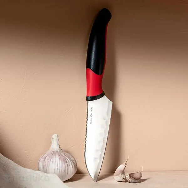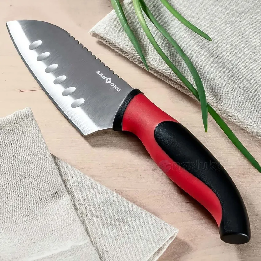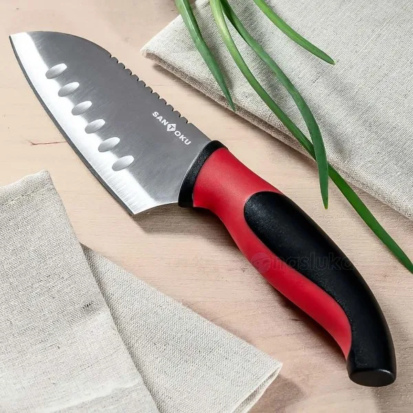 Острието от висококачествена неръждаема стомана осигурява чисто рязане, докато специалният дизайн на Santoku позволява лесно и контролирано нарязване на месо, риба и зеленчуци.🌿