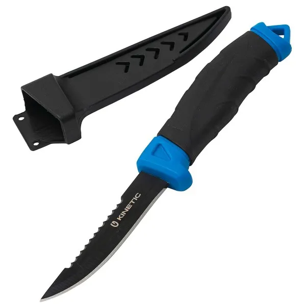 Назъбената част от острието осигурява прецизно рязане. 🎣 Ергономичната дръжка с мека повърхност гарантира сигурен захват дори при влажни условия.