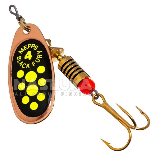 Mepps Black Fury е чудесна въртяща блесна с изключително богата окраска, която имитира най-често улавяната плячка - щурци, скакалци, жабки, водни и земни ларви и лещанки в брачна украса.