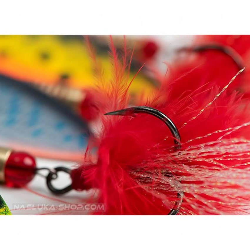 На тройната кука е добавен голям червен помпон, предизвикващ към атака и най-апатичния хищник.