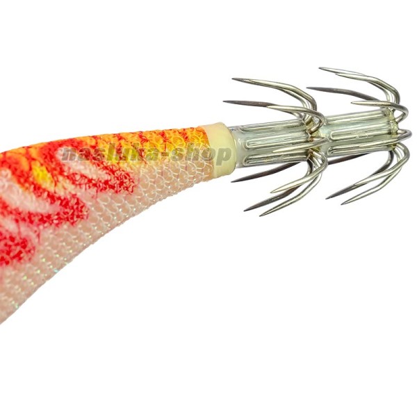 - Светлинни ефекти: Примамката разполага с допълнителни фосфоресциращи елементи на корема и гърба, които увеличават видимостта ѝ в тъмни води, правейки я по-привлекателна за калмарите.