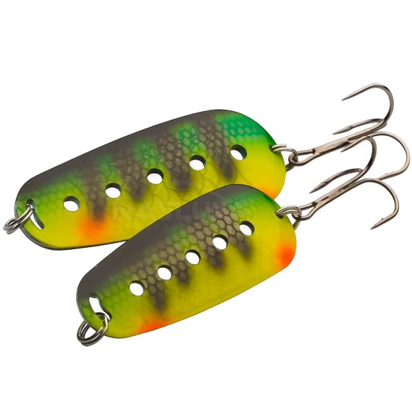 Kinetic Spoony е изработена от здрава метална сплав, която гарантира устойчивост при атаки на хищниците. Повърхността е с ефектно покритие и реалистични окраски, комбинирани с ярки отблясъци, които провокират щуката.
