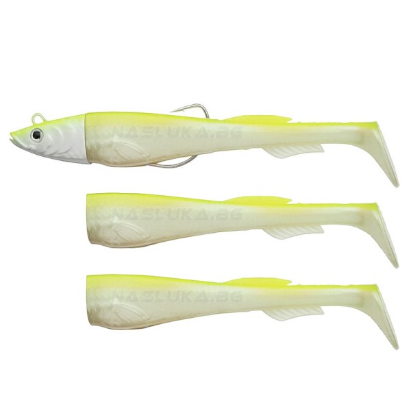 Комплектът включва една джиг глава с устойчива на корозия офсетна кука и три силиконови шада.