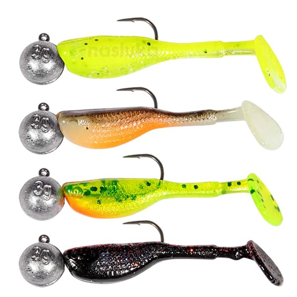 UV покритието усилва видимостта на примамката и в мътна вода, а реалистичният дизайн имитира дребна рибка. Монтираните джиг глави осигуряват перфектна балансировка и движение.