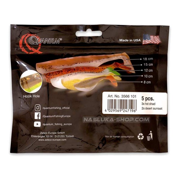 Сет Quantum Q-Paddler - UV Power включва общо 5 силиконови примамки, три от които са в цвят Hot Shad и два броя Desert Sunset.