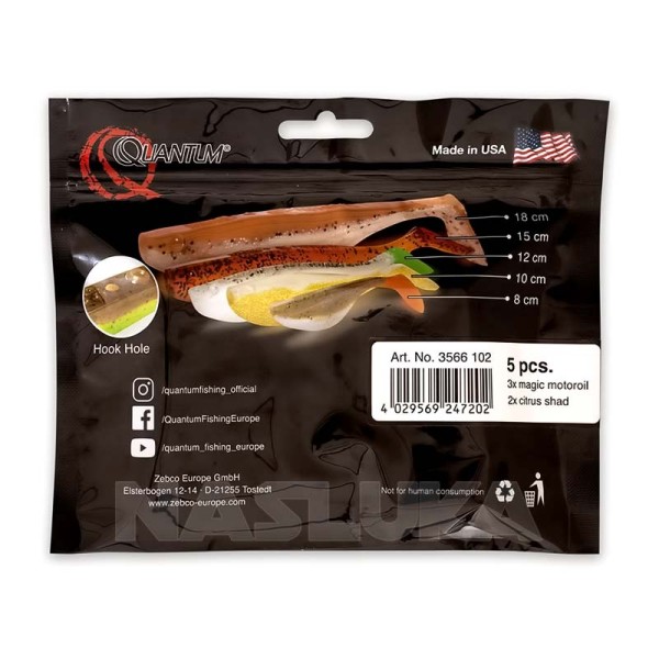 Сет Quantum Q-Paddler - UV Power Mix включва общо 5 силиконови примамки, три от които са в цвят Magic Motoroil и два броя Citrus Shad.