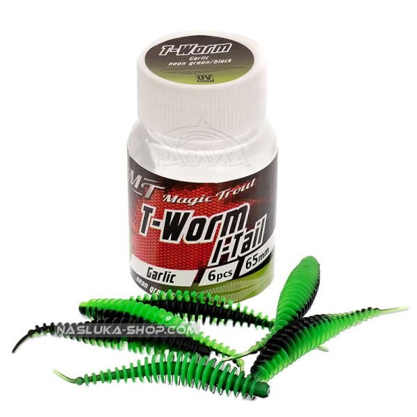 Силиконови ароматизирани примамки Magic Trout T-Worm I-Tail, Neon Green Black