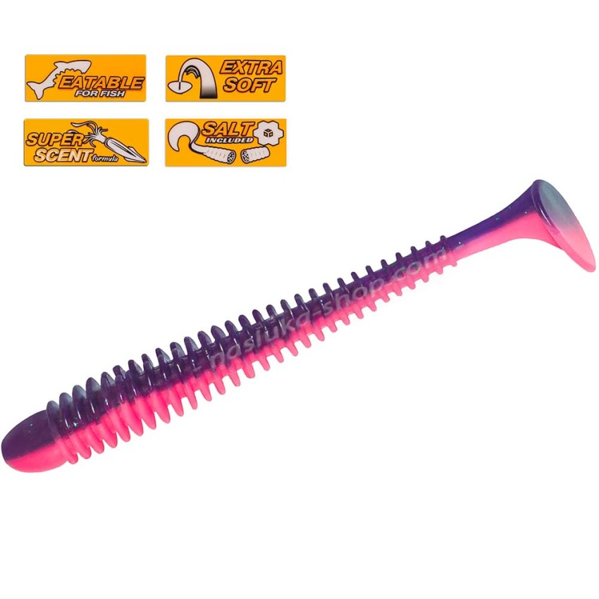 Оребреното тяло създава допълнителни вибрации, които заедно с атрактивното движение на примамката активно привличат рибите и те смело атакуват силикона.