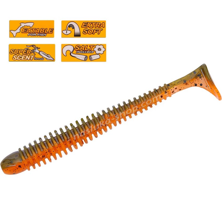 Оребреното тяло създава допълнителни вибрации, които заедно с атрактивното движение на примамката активно привличат рибите и те смело атакуват силикона.