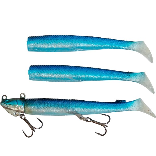 Задай въпрос относно Комплект от 3 силиконови шада с джиг глава и куки Sunmile, Blue, 10 см, 14 г