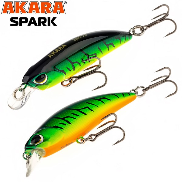 Akara Spark 50S е компактен sinking minnow воблер, създаден за прецизен ултралайт риболов. С дължина 50 mm и тегло 3.5 g, моделът е идеален за пъстървакостуркефал и други активни хищници в реки и езера.
