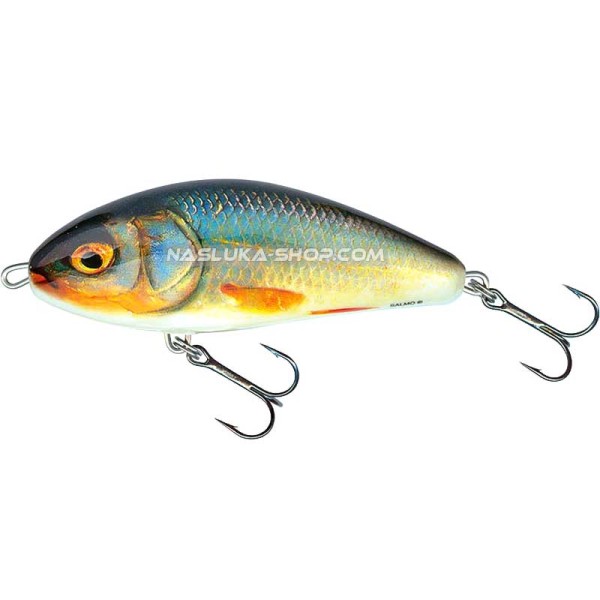 Примамка за улов на трофейни екземпляри щука и сом. Salmo Fatso е воблер, който притежава типичната игра на кранкбайт, независимо, че е lipless модел (без лопатка).