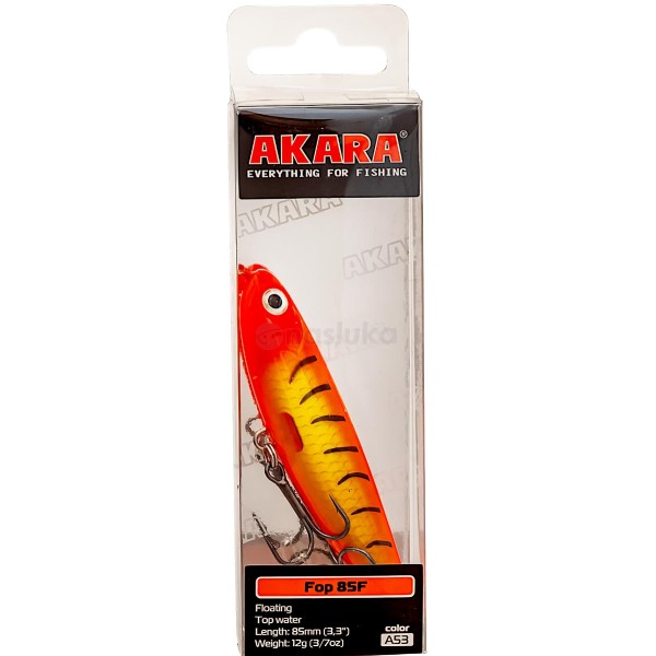 Воблер Akara Fop 85F 85 мм, 12 г - цвят A53 е повърхностна примамка с агресивна и шумна игра, подходяща за спининг риболов на щука и распер.