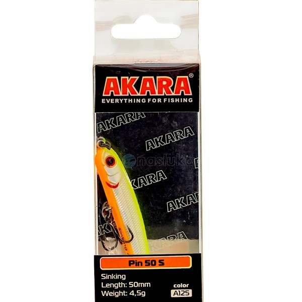 Воблер Akara Pin 50S 50 мм, 4.5 г - цвят A125 е прецизно балансиран потъващ воблер, създаден за риболов в по-спокойни водоеми и участъци с рязка промяна в дълбочината.