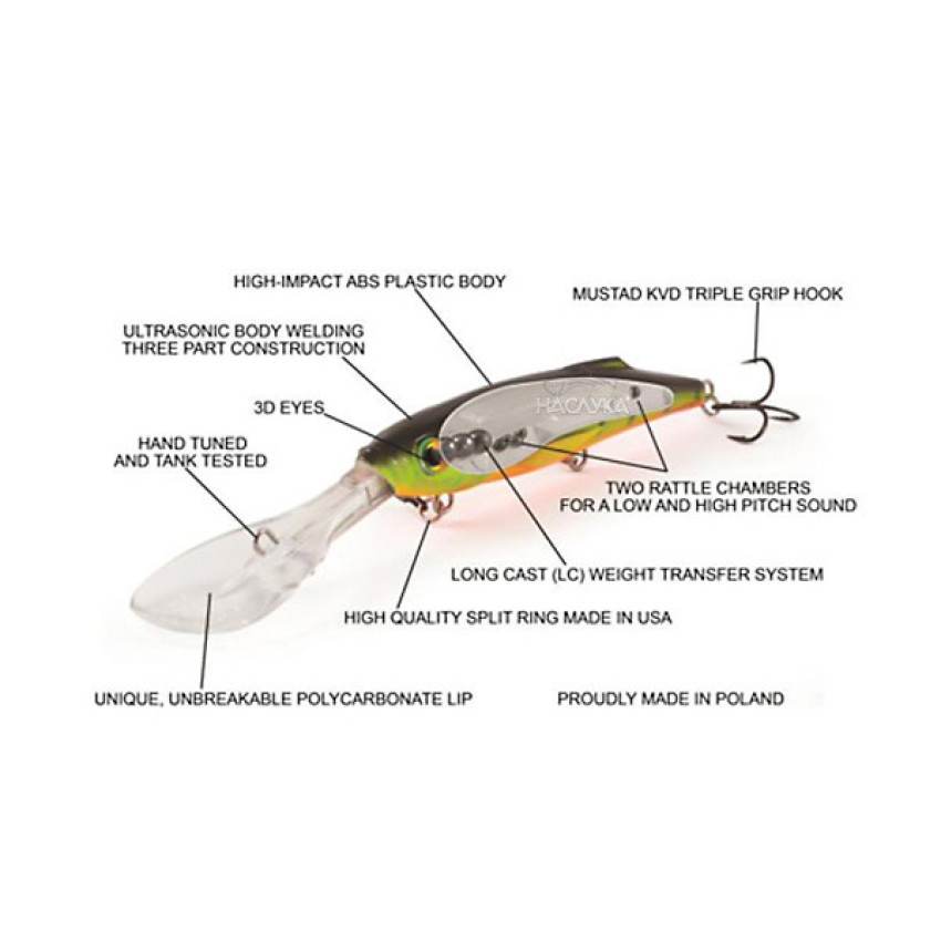 Модерният начин на проектиране на FreeDiver гарантира стабилност и перфектна игра при всякаква скорост на водене. Воблерите FreeDiver са оборудвани с висококачествени тройни куки Mustad KVD Triple Grip.