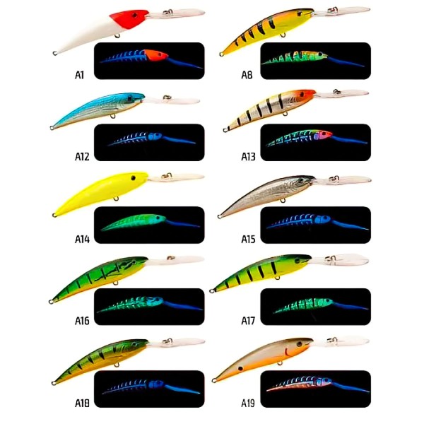 Цветовата гама включва UV и натурални тонове, подходящи за всякакви водни условия. Здравата пластмасова конструкция издържа на многократни удари от едри екземпляри.