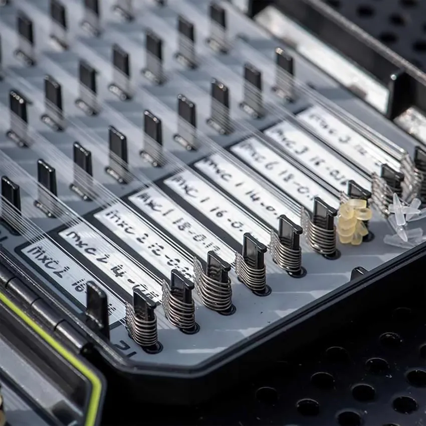 Да, има вътрешни и външни етикети за лесна организация по вид монтаж или риба.