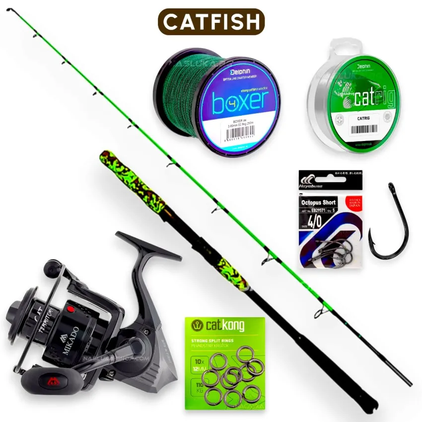 Готов комплект за сом с всичко необходимо за успешен риболов на едри хищници. Включва усилена въдица Delphin Monstro 2 с дължина 2.10 метра и акция до 200 грама, специализирана макара Mikado Cat Territory 6006 FD и пълен набор от аксесоари. 🎣